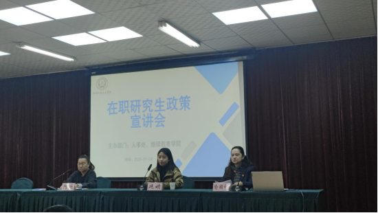 继续教育学院院长喻丽娜重点结合《教育部办公厅关于开展普通高等学校本科教学工作合格评估的通知》中本科办学要求教师队伍指标基本要求“专任教师中具有硕士学位、博士学位的比例≥50%”、“在编的主讲教师中90%以上具有讲师及以上专业技术职务或具有硕士、博士学位,并通过岗前培训。”等的要求,鼓励教师多措并举积极提升学位。同时,针对教师报考同等学力升硕存在的困惑、疑点集中进行了解疑答惑。