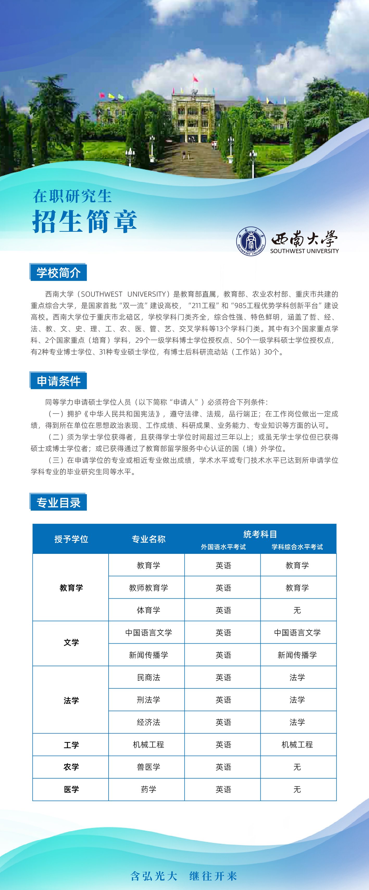 Beat365中文官方网站联合“西南大学”开办“在职研究生”招生简章 作者:张绍文 来源:继续教育学院(成教部 发布时间:2025-03-12 18:05:38 点击数: 次 联系人:陈江明 电话:15235378411 联系人:喻丽娜 电话:13657531716 终审:继续教育学院(成教部) 分享到: 【打印正文】 相关内容