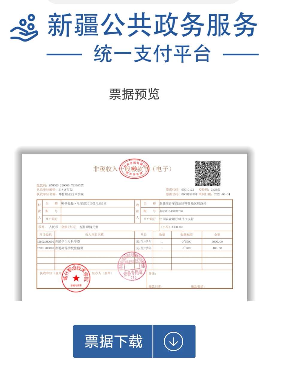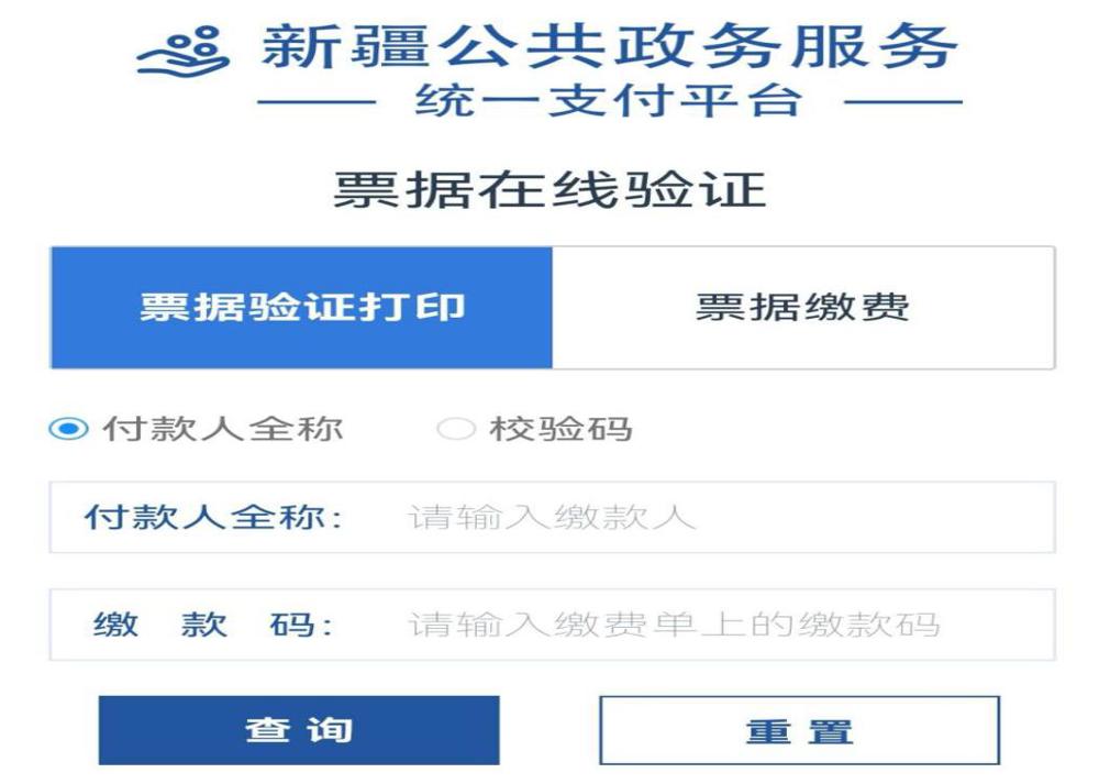 第四步:缴费成功24小时后,在已连接打印机的电脑上,登陆电子缴款书查验网站:http://finpt.xjcz.gov.cn(此网站在缴款人收到的短信中也显示),输入第二步短信上的付款人全称和缴款码,方可下载保存、打印已缴费的电子票据,如下图(使用手机登录也可下载保存)。