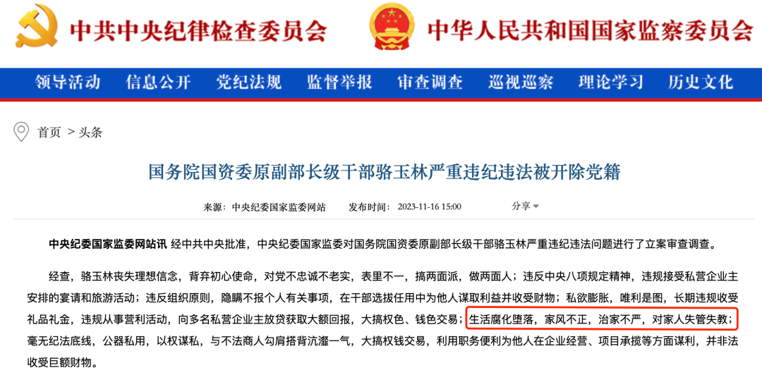 比如,国务院国资委原副部长级干部骆玉林,“生活腐化堕落,家风不正,治家不严,对家人失管失教”;