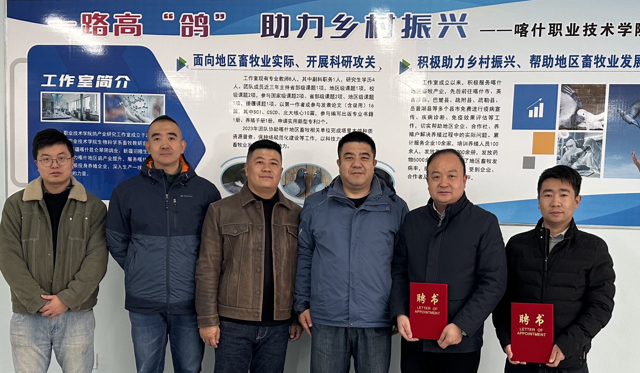 2024年1月3日,疏附县科学技术局党组副书记、局长童晓军、疏附县科学技术局项目办主任孙伟伟赴学院调研指导科研平台建设及成果转化、社会服务情况,实地考察院级科研平台-塔里木鸽研究工作室中心,听取学院在科学研究、成果转化及主动服务喀什地方经济、社会发展中的情况汇报。新疆喀什昆仑翠翎鸽业有限责任公司负责人王泽武全程参与指导。