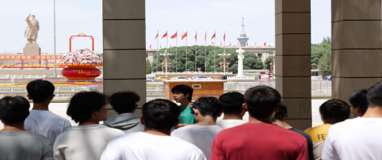 在自由活动环节,同学们怀着无比崇敬的心情,有序与毛泽东雕像合影。有的默默瞻仰,有的认真记录,还有的即兴创作“我给毛主席说句心里话”微视频,用青春的方式表达对伟人的深切缅怀。