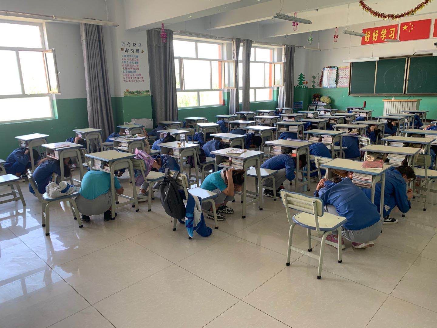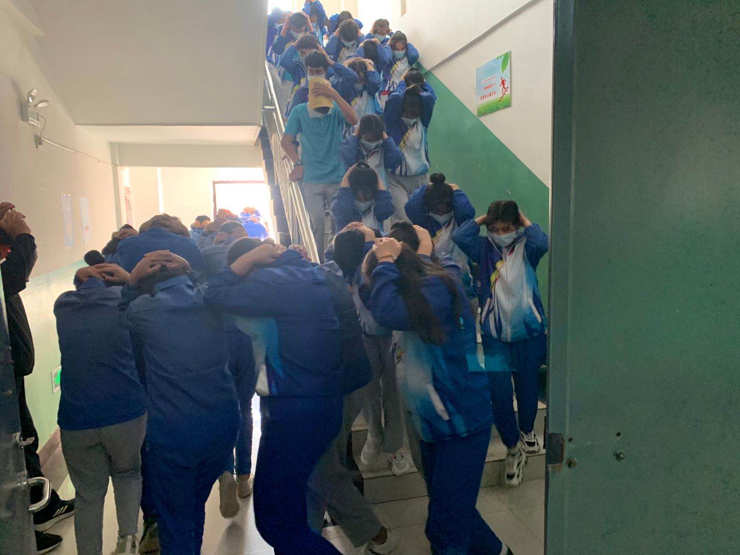 下午四点演练开始,警报声响起,学生在老师的组织下用书本或者双手保护头部躲在课桌下。当警报声再次响起,各班班主任指挥本班级的学生进行安全疏散,带领本班学生疏散到安全地点后立即清点人数,并立即向现场总指挥报告人数,同时协助现场维持秩序,对没有疏散出来的学生立即组织营救。