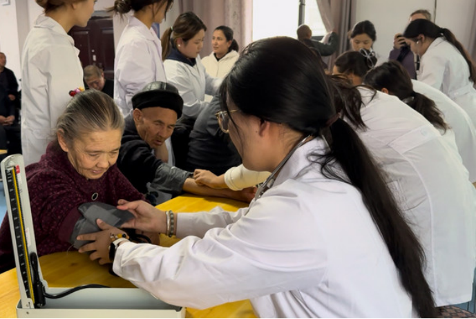 健康守护递温暖:医学院学生设立健康驿站,为23位老人测量血压血糖,图文并茂讲解中医保健穴位;护理专业志愿者演示康复训练操。