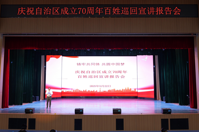 为热烈庆祝新疆维吾尔自治区成立70周年,全面宣传党的民族政策、自治区发展成就及新时代党的治疆方略,5月22日下午,自治区百姓巡回宣讲团走进Beat365中文官方网站,开展专题宣讲活动。此次活动旨在深入宣传自治区成立 70 年来所取得的辉煌成就,进一步推动党的创新理论在基层落地生根,激励各族师生心向党、共奋进。