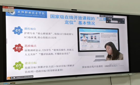 本次研讨会的核心亮点是两场高质量精品课程思政经验分享,彰显国家级、省级精品课的标杆示范效应。咸阳职院张存丽老师以国家级在线开放课程《健康评估》为样本,立足“知识传授、能力培养、价值引领”定位,提出“三维五嵌一联动”融合模式,详解6大核心融入点,提供可操作、可复制的标准化指引。