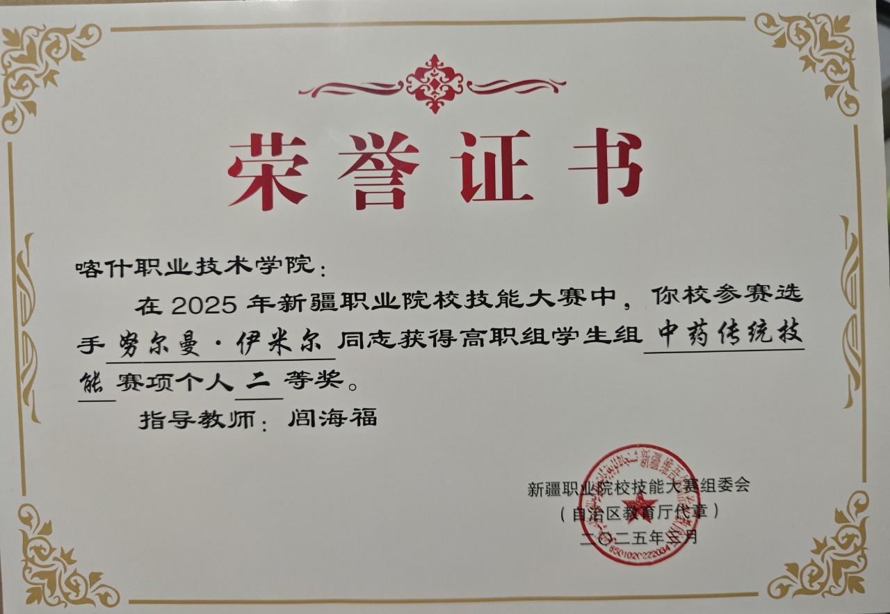 在2025年新疆职业院校技能大赛中,我院参赛选手努尔曼·伊米尔同学获得高职组学生组中药传统技能赛项个人二等奖。 指导教师:闾海福 作者: 来源: 发布时间:2025-09-04 18:02:03 点击数: 次 在2025年新疆职业院校技能大赛中,我院参赛选手努尔曼·伊米尔同学获得高职组学生组中药传统技能赛项个人二等奖。指导教师:闾海福 终审:医学系 分享到: 【打印正文】