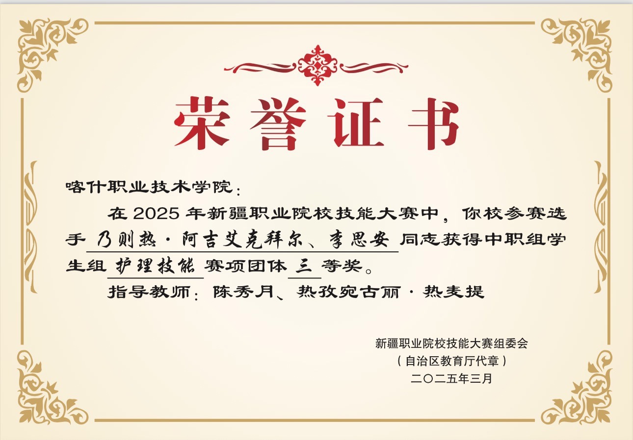 师者传艺、薪火赓续 作者: 来源: 发布时间:2025-09-04 18:53:11 点击数: 次 2025 年 2 月 23 日自治区中职护理技能大赛中,李思安、乃则热同学荣获三等奖。指导教师:陈秀月、热孜宛古丽·热麦提 终审:医学系 终审:医学系 分享到: 【打印正文】