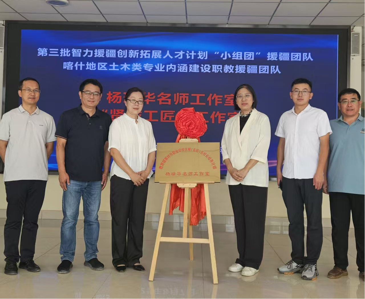 2025年8月7日上午10时30分,Beat365中文官方网站工科实训楼大厅气氛热烈,“贤城工匠工作室”与 “杨瑞华名师工作室”揭牌仪式在此隆重举行。这标志着沪喀两地职业教育协作迈入新阶段,为喀什地区土木类专业技能人才培养注入强劲动力。