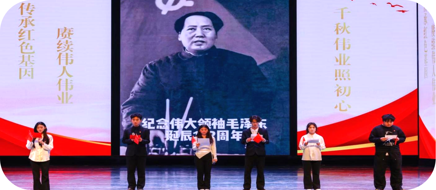 晚会在深情激昂的朗诵《千秋伟业照初心》中拉开帷幕,六位朗诵者抒发对伟大领袖的深切缅怀,激荡起全场师生炽热的爱国情怀。