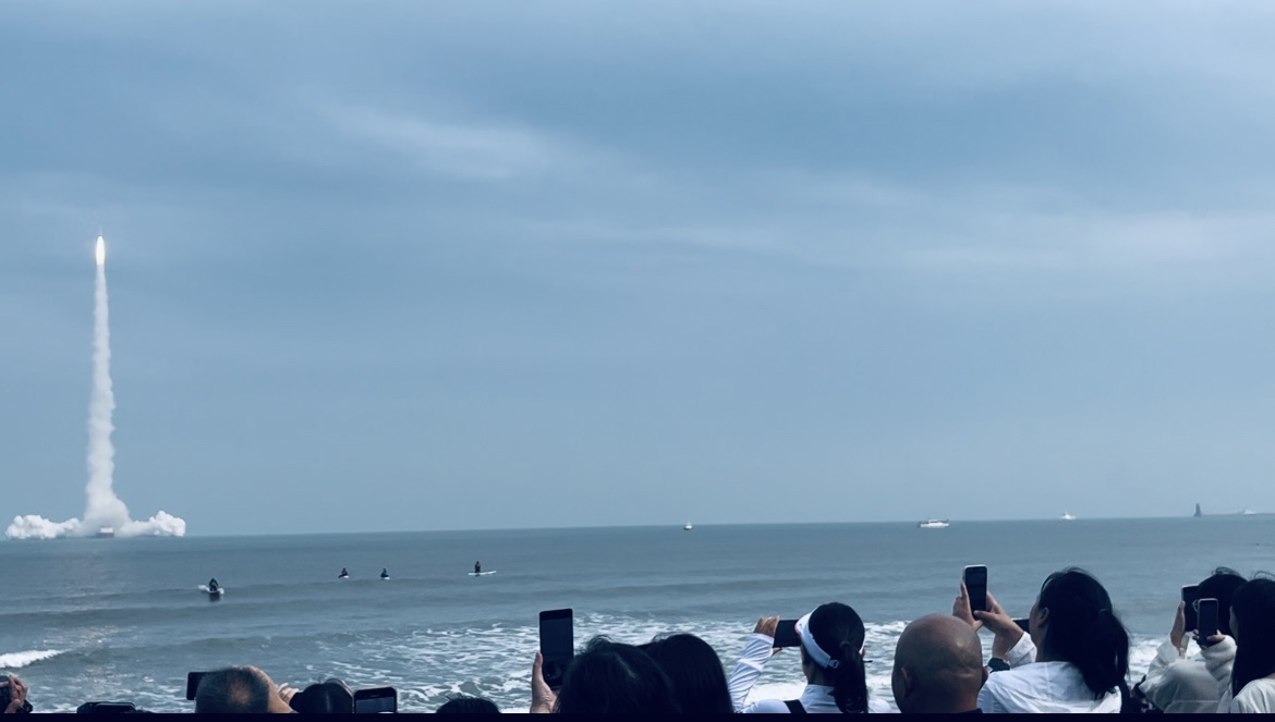 火箭发射前夕,乳白色箭体矗立在距海岸3公里的平台上,与碧海蓝天交相辉映。随着 “3、2、1—— 点火!” 指令发出,火箭尾部喷薄出炽白烈焰,轰鸣声掠过海面,同学们与现场数万观众一同欢呼鼓掌,同学们纷纷举起手机记录这一震撼瞬间,眼中满是兴奋与自豪。